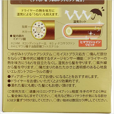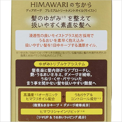 うるおいを素早く抱え込み、扱いやすい髪を1日中キープする浸透性の良い濃厚オイル。ゆがみトリプルケアシステムを新採用。髪内部と髪表面からアプローチし、ダメージを補修して艶とうるおいを与えます。ドライヤーの熱を味方に髪のうねりを効果的に伸ばし、湿気から髪をガードして、扱いやすい艶髪へと導きます。ヒマワリシャインリピッド(ツヤUP&うるおいラッピング成分)を新配合。髪表面をしっかりコートし、湿気によるうねりを抑制します。陽だまりのあたたかさと透明感のある心地良いエレガントフローラルの香り。