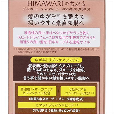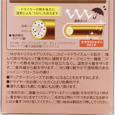 手はベタつかずサラッと乾き、毛先までさらりと指通りの良い髪を1日中キープする浸透性の良い速乾オイル。ゆがみトリプルケアシステムを採用。髪内部と髪表面からアプローチし、ダメージを補修して艶とうるおいを与えます。ドライヤーの熱を味方に髪のうねりを効果的に伸ばし、湿気から髪をガードして、扱いやすい艶髪へと導きます。ヒマワリシャインリピッド(ツヤUP&うるおいラッピング成分)を配合。髪表面をしっかりコートし、湿気によるうねりを抑制します。光り輝く軽やかで透明感のあるシャイニーフローラルの香り。