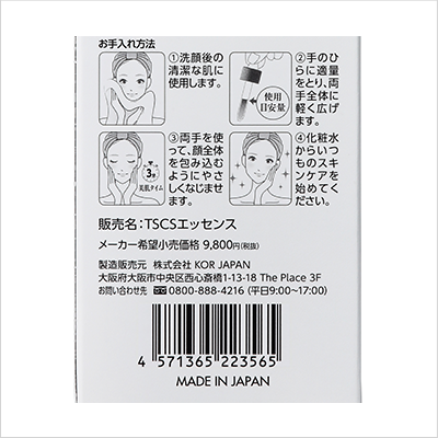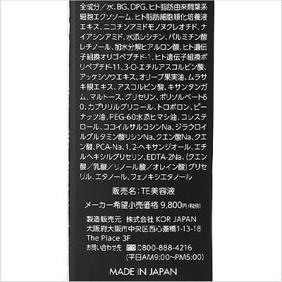 水、PG、グリセリン、フェノキシエタノール、キサンタンガム、BG、クエン酸Na、PCA−Na、EDTA−2Na、クエン酸、ジラウロイルグルタミン酸リシンNa、キハダ樹皮エキス、ナイアシンアミド、パルミチン酸アスコルビルリン酸3Na、ヒト脂肪細胞順化培養液エキス、水添レシチン、(クエン酸/乳酸/リノール酸/オレイン酸)グリセリル、オリーブ果実油、3−O−エチルアスコルビン酸、アスコルビン酸、バクチオール、ヒト脂肪由来間葉系細胞エクソソーム、レチノール、コレステロール、1,2−ヘキサンジオール、PEG−60水添ヒマシ油、カプリリルグリコール、ジヒドロコレス−20、トロポロン、ポリソルベート60、リン酸アスコルビルMg、パルミチン酸レチノール、ピーナッツ油、メチルパラベン、PEG−100水添ヒマシ油、トリエチルヘキサノイン、酢酸トコフェロール、トコフェロール