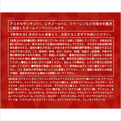 コラーゲン、ヒアルロン酸、グリチルリチン酸、植物プラセンタなどの厳選保湿美容成分をはじめ、レチノール、フラーレンなど、エイジングケア成分として注目の美容成分などを贅沢に配合。