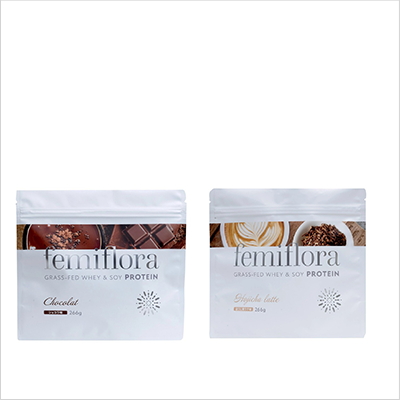 フェミフローラ グラスフェッド&ソイプロテイン ショコラ味・ほうじ茶ラテ味2種2個